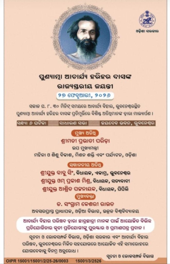 ଆଚାର୍ଯ୍ୟ ହରିହର ଦାସଙ୍କ ଜୟନ୍ତୀ // ଆଚାର୍ଯ୍ୟ ହରିହର ଶିକ୍ଷକତା , ସ୍ୱାଧୀନତା ସଂଗ୍ରାମ, ଭୂଦାନ ବାର୍ତ୍ତା ପ୍ରଚାର, ଜନସେବା ଭଳି କ୍ଷେତ୍ରରେ ତାଙ୍କର ନିରବଚ୍ଛିନ୍ନ କାର୍ଯ୍ୟ ସମସ୍ତଙ୍କ ସ୍ମରଣିୟ