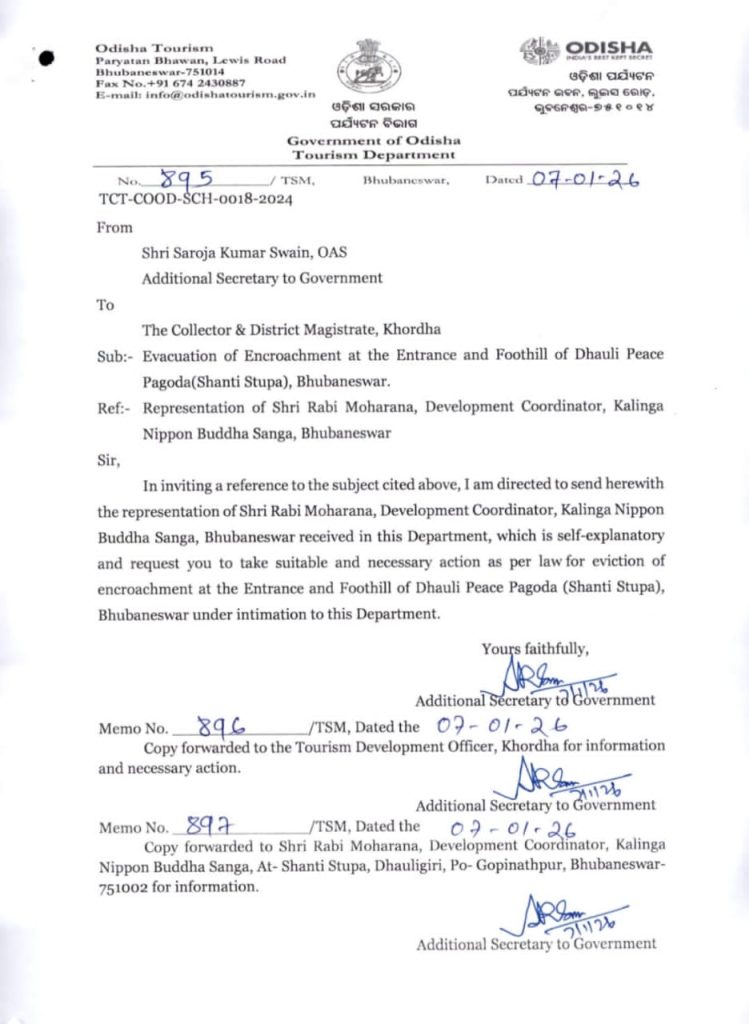 ପର୍ଯ୍ୟଟନ ବିଭାଗ ପକ୍ଷରୁ ଜାରି ହୋଇଥିବା ଏକ ଆଧିକାରିକ ପତ୍ରରେ ଅତିରିକ୍ତ ସଚିବ ଶ୍ରୀ ସରୋଜ କୁମାର ସ୍ୱାଇଁ, ଖୋର୍ଦ୍ଧା ଜିଲ୍ଲାପାଳ ଓ ଜିଲ୍ଲା ଦଣ୍ଡାଧିକାରୀଙ୍କୁ ଆଇନ ଅନୁଯାୟୀ ଆବଶ୍ୟକ ଓ ଉଚିତ କାର୍ଯ୍ୟାନୁଷ୍ଠାନ ନେବାକୁ କହିଛନ୍ତି।