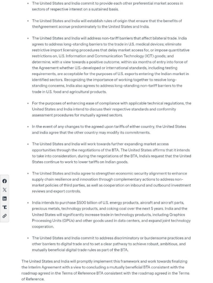 ЁЯЗоЁЯЗ│India commits to eliminate or reduce tariffs on all U.S. industrial goods and a wide range of U.S. food/agricultural products (e.g., dried distillersтАЩ grains, red sorghum, tree nuts, fresh/processed fruit, soybean oil, wine/spirits, and more).