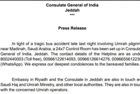 Last night, the pilgrims belonging to Telangana, who were coming to Madinah after completing their Umrah from Makkah, became victims of an accident 25 km before Medina in Mufrihat. It happened when a bus carrying 45 pilgrims collided with an oil tanker. As per the information, about 42 people are said to have died in it, and a child is injured and is undergoing treatment,” he said.